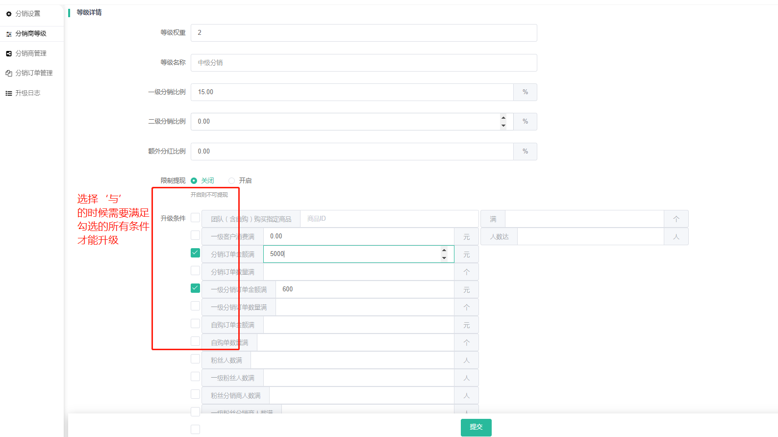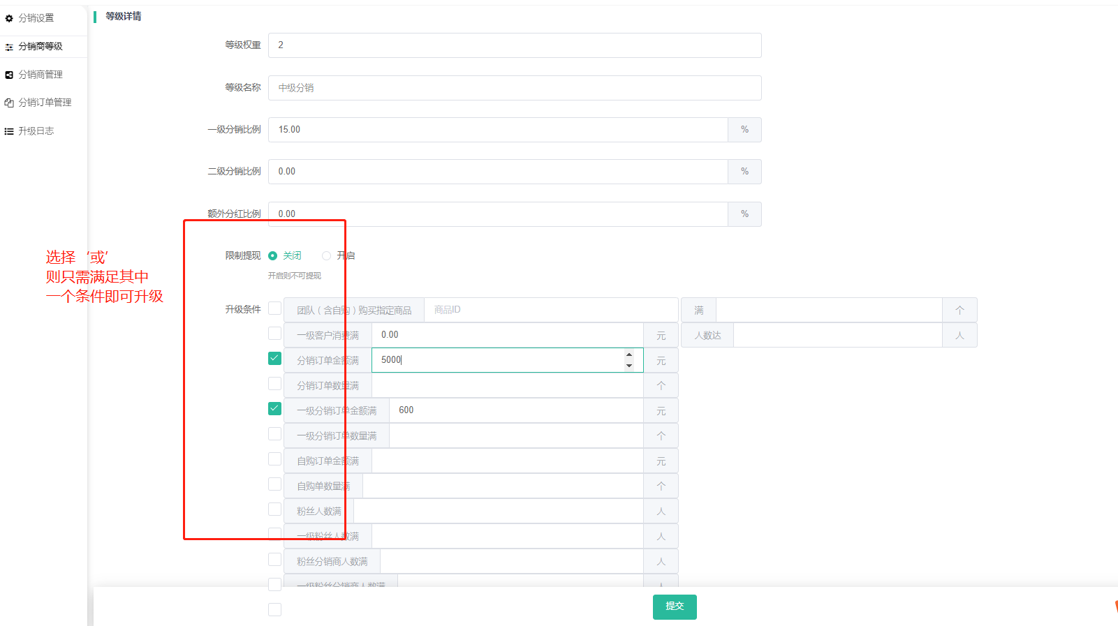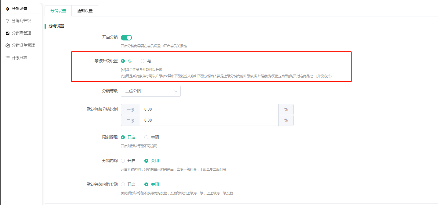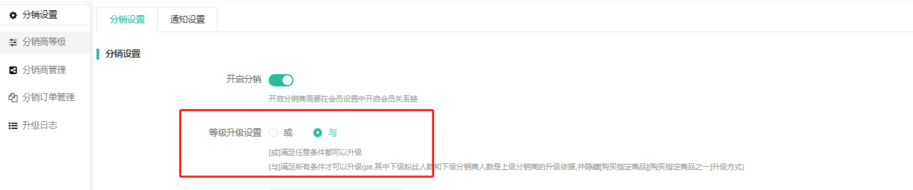当分销设置--等级升级设置选择:与的时候