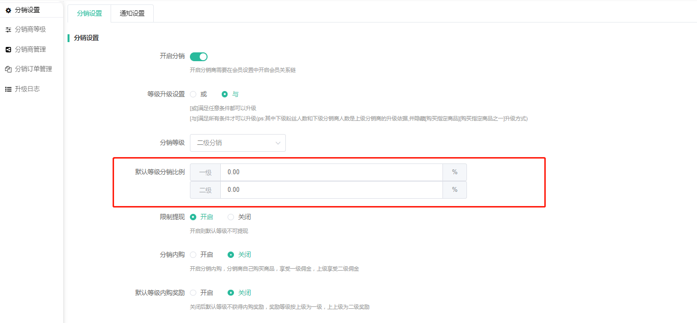 默认等级分销比例:设置了比例,则商城的普通会员也能推广获得佣金