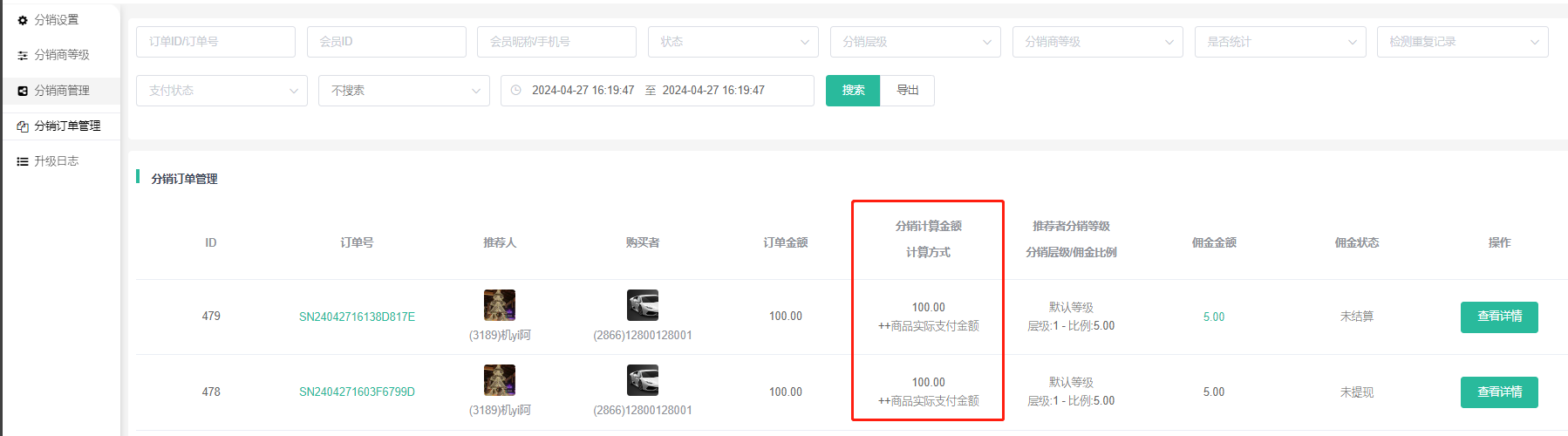 佣金信息,订单获得的佣金状态,分销等级和比例设置开启关闭效果如下