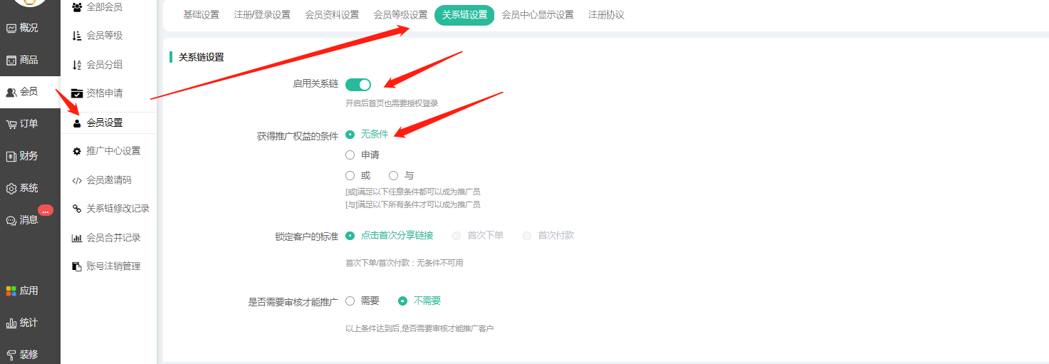 开启分销按钮(注意*开启分销商需要在会员设置中开启会员关系链,不然推广后无法锁定上下线关系),开启后,用户想要成为分销商需要先满足成为推广员的条件,即可成为分销商。成为推广员的条件设置路径:商城后台--会员--会员关系设置--开启关系链,设置成为推广员条件.