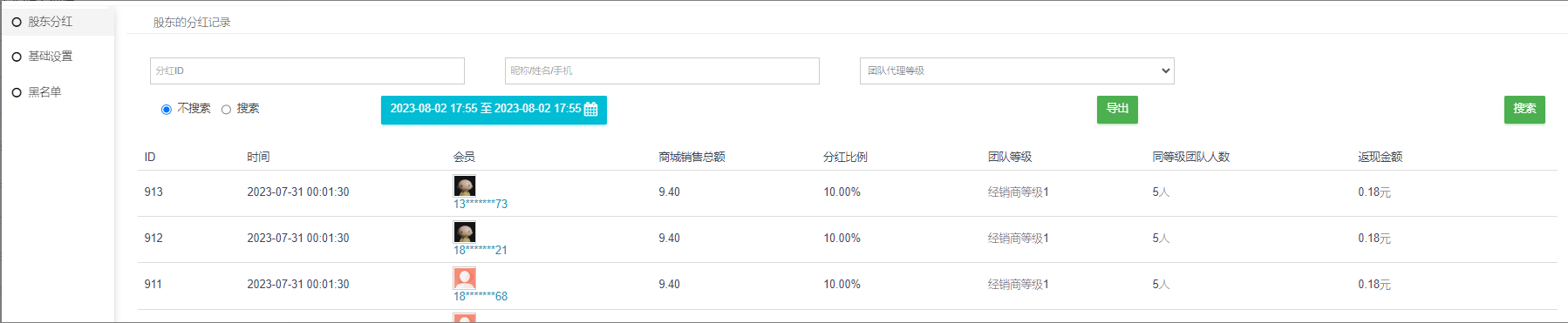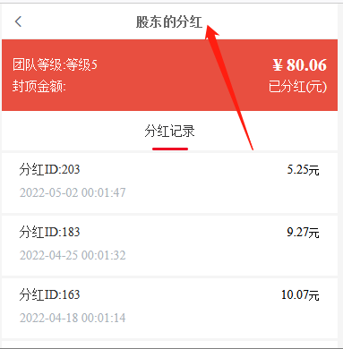 记录每一笔分红信息,包含ID、时间、会员、商城销售总额 、分红比例、团队等级、同等级团队人数、分红金额。
