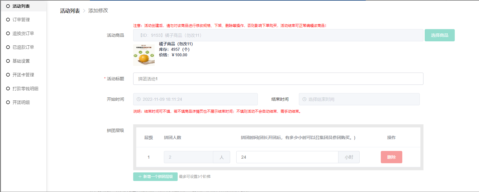 4) 拼团层级:最多可设置三个阶梯,设置好后不可修改