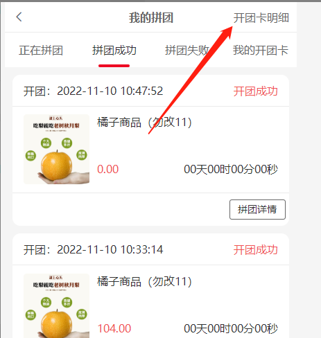 5, 可点击查看明细查看该开团卡明细
