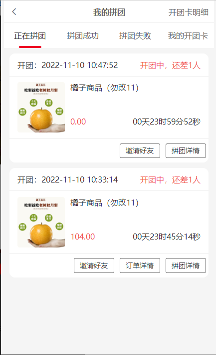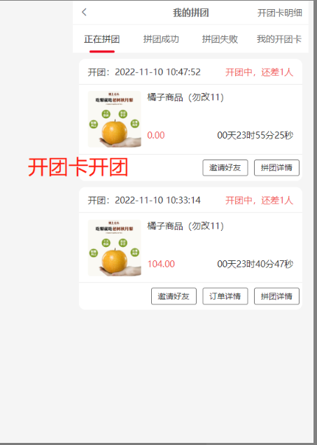 2, 正在拼团:还未拼成功的团,状态处团长显示开团中,拼团会员显示拼团中,开团卡开的团没有订单详情按钮