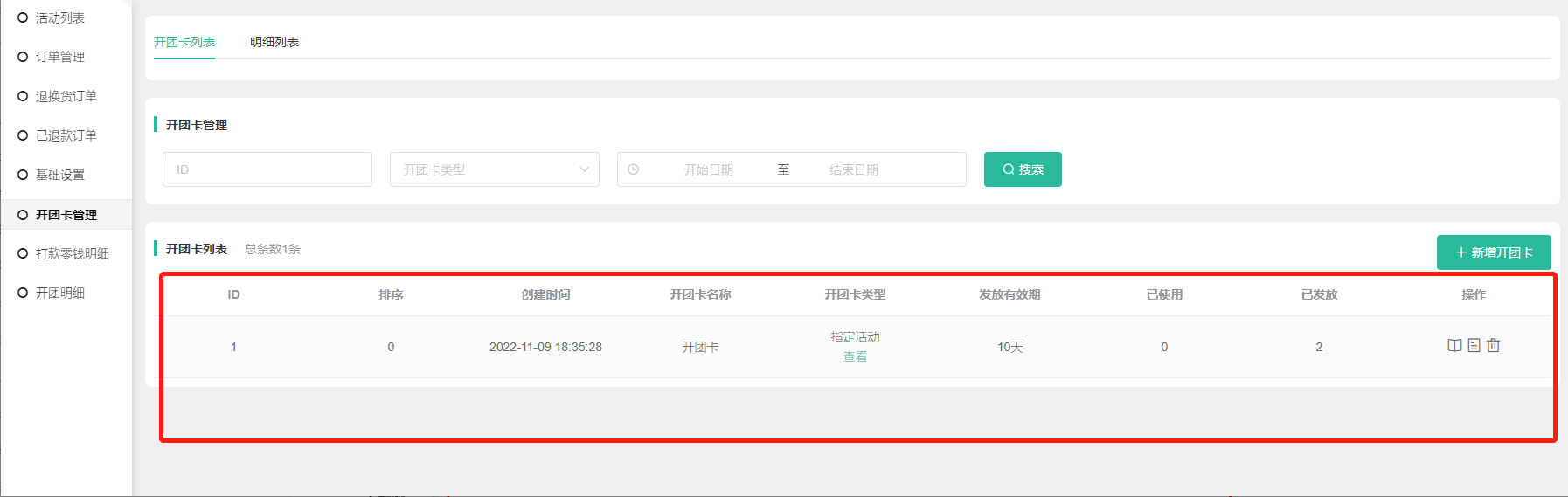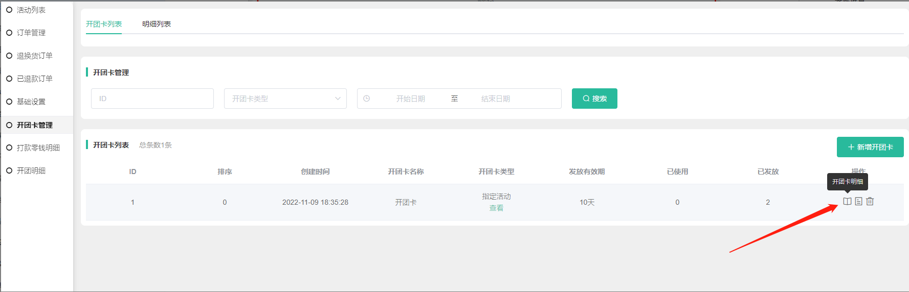 4, 在开团卡列表可查看到开团卡名称、开团卡类型,指定活动类型的可点击查看活动,发放有效天数,已使用数量、已发放数量