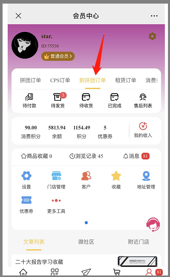 1, 会员中心,订单处显示新拼团订单