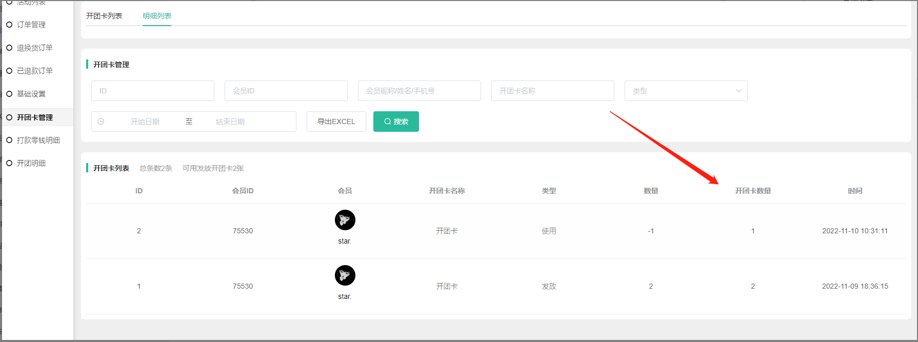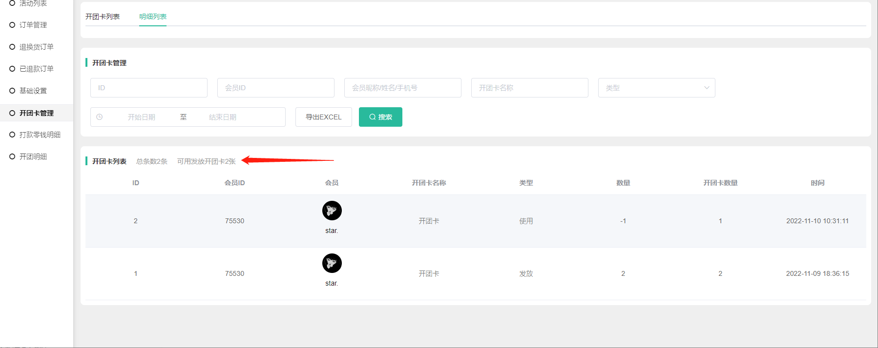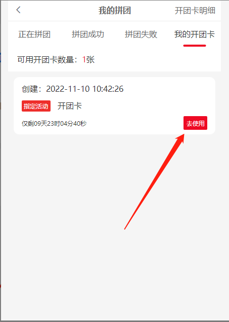 2) 开团卡数量:该开团卡该会员的可使用数量