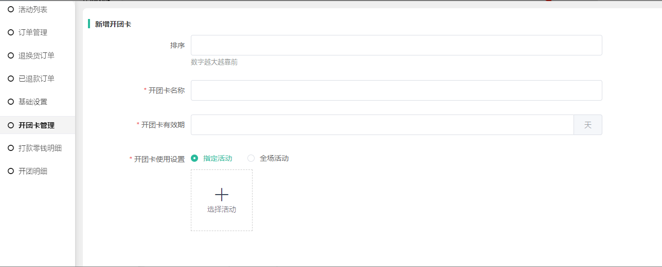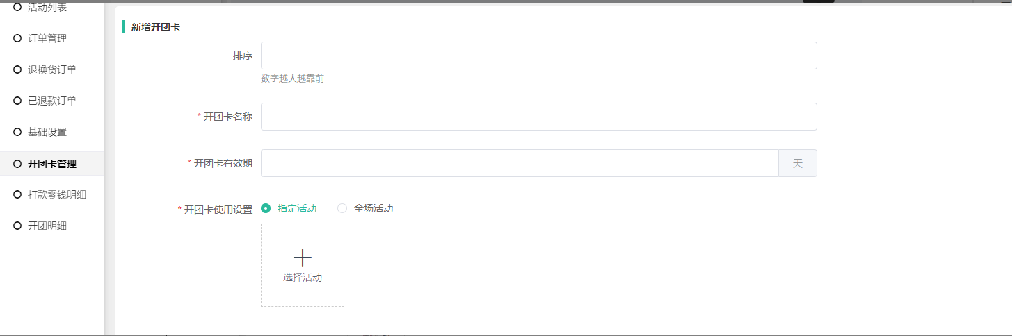 2, 新建开团卡:设置开团卡排序(数字越大排在前面,仅后端开团卡列表的显示),开团卡名称,开团卡有效期(设置为0发放后大概十分钟过期),开团卡活动,指定活动可设置多个