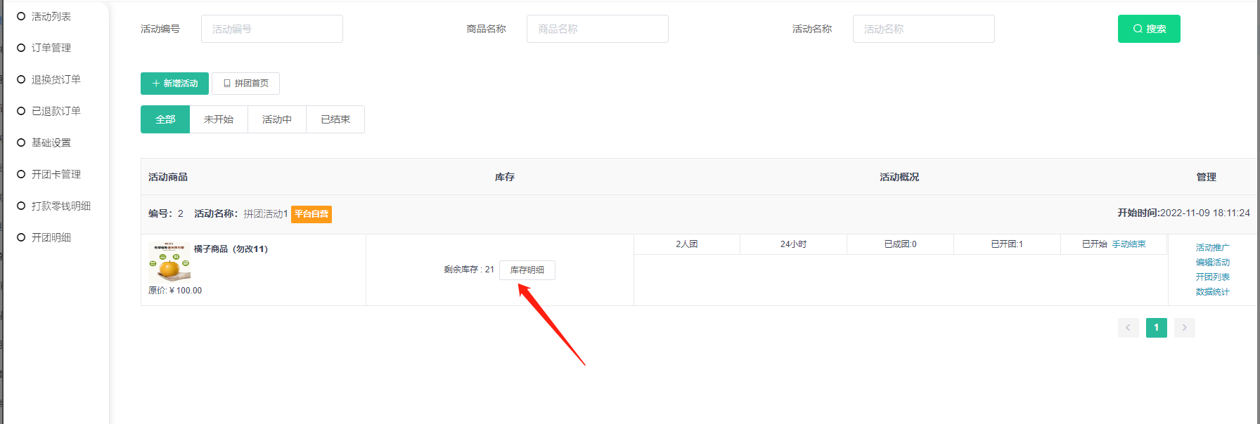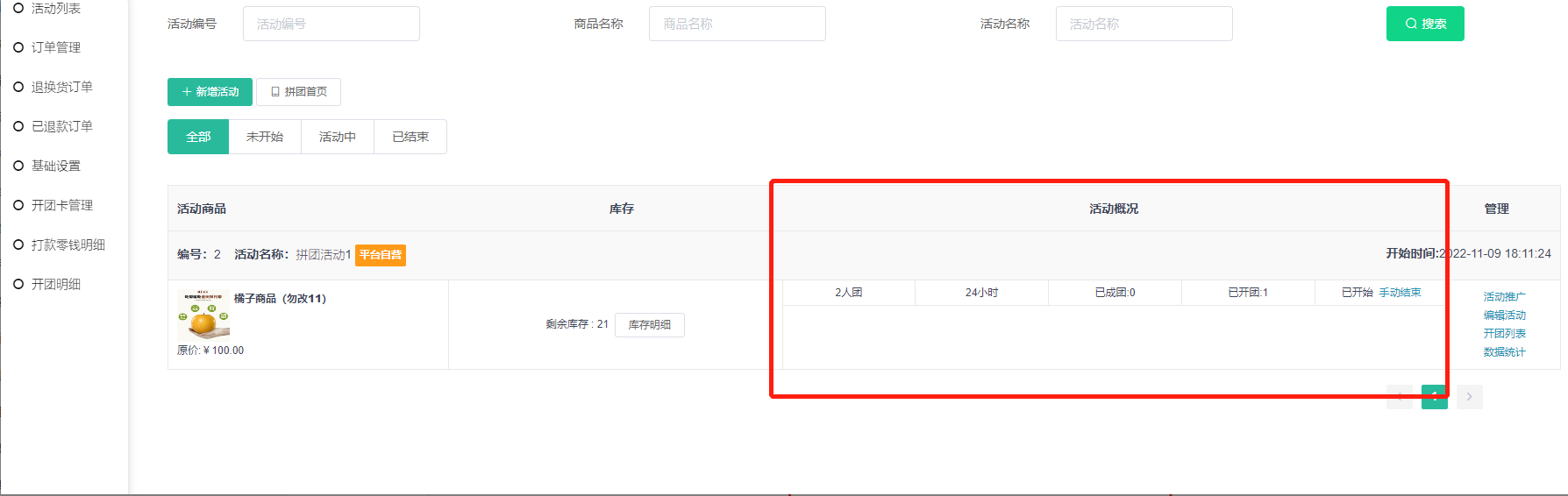 2, 活动概况:已开团数量和已成团数量,可手动结束拼团