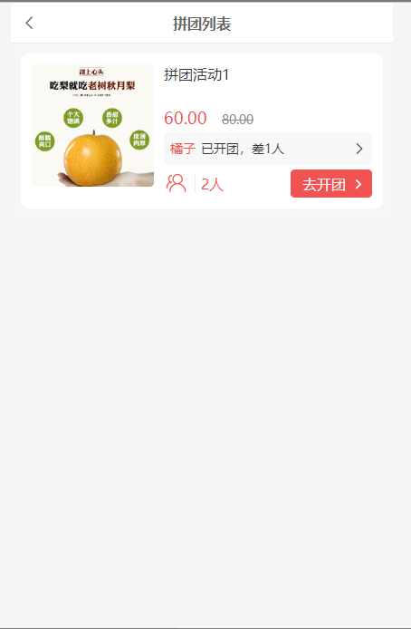 1, 在拼团活动聚合页可查看到已开始、未结束的拼团活动,在此列表可查看到拼团活动名称、拼团最低金额,拼团最低金额所需人数,拼团中拼团(后台基础设置需要开启),点击去开团跳转到拼团活动详情页