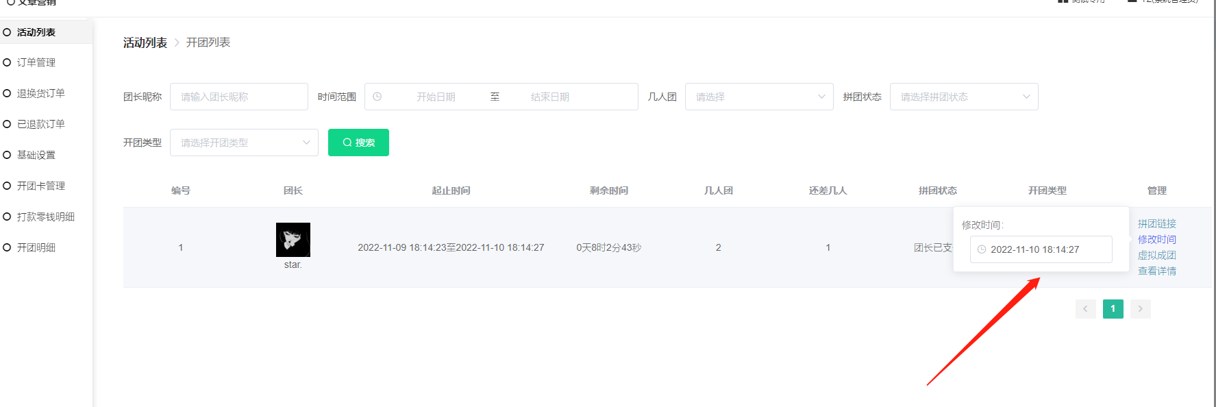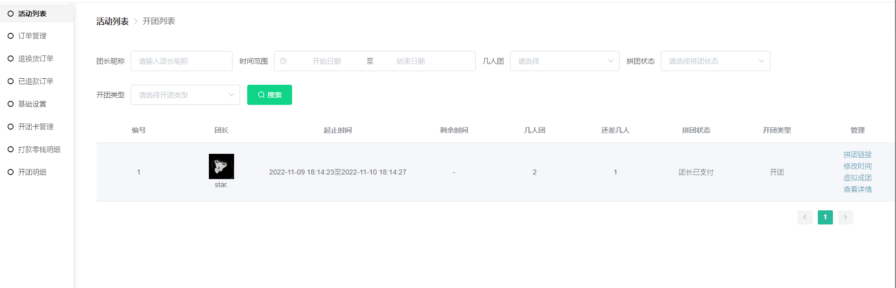 1) 此列表显示拼团团长、起止时间、剩余时间、几人团、还差几人、拼团状态、开团类型