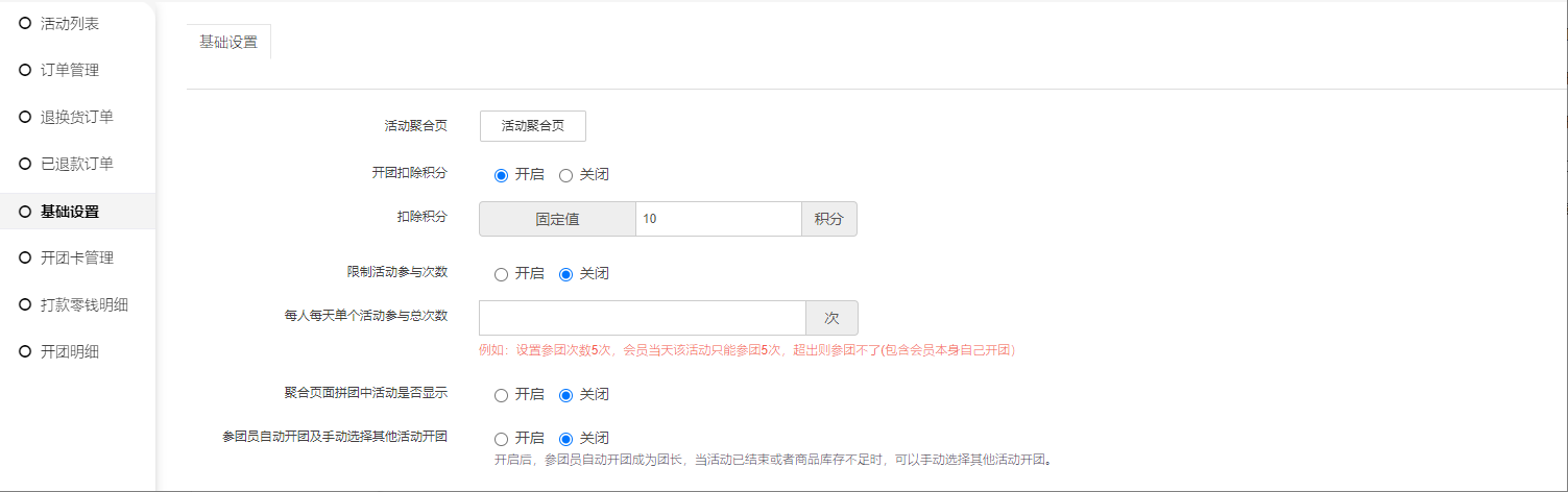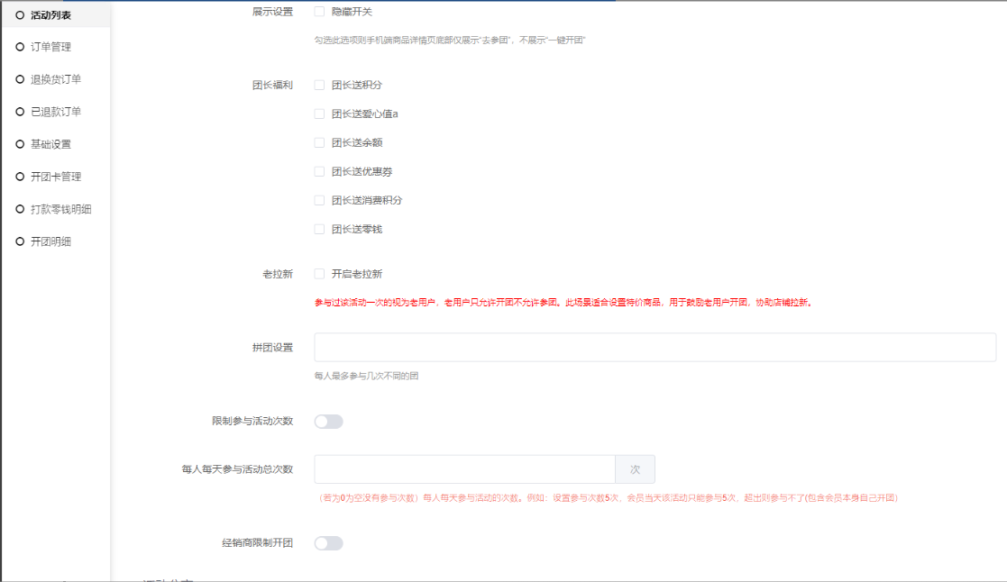 3, 聚合页面拼团中活动是否显示:开启后前端聚合页面,活动列表会显示正在拼团中的拼团