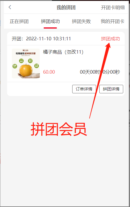 4, 拼团成功:状态处团长显示开团成功,拼团会员显示拼团成功