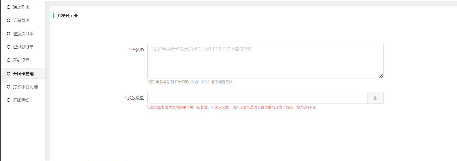 6, 分发开团卡:输入会员昵称、每个会员分发张数。开团卡的有效期从分发的时候开始计算。分发开团卡可分发负数,发放负数优先扣除时间快结束的
